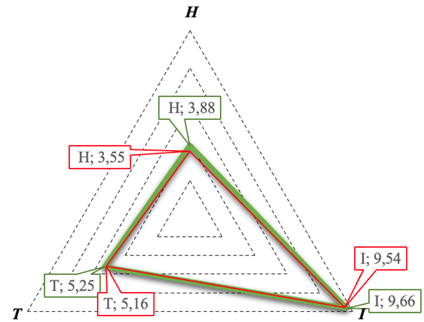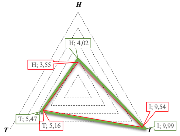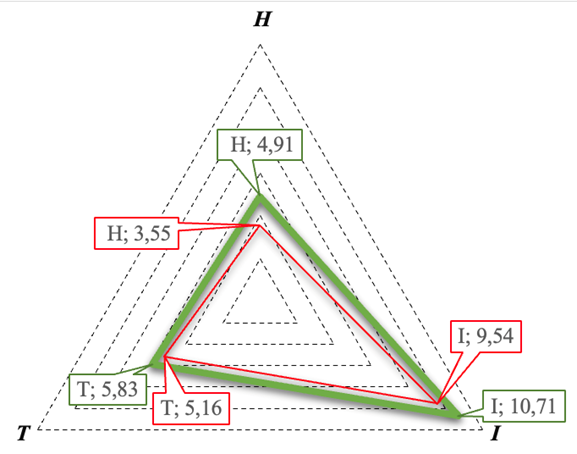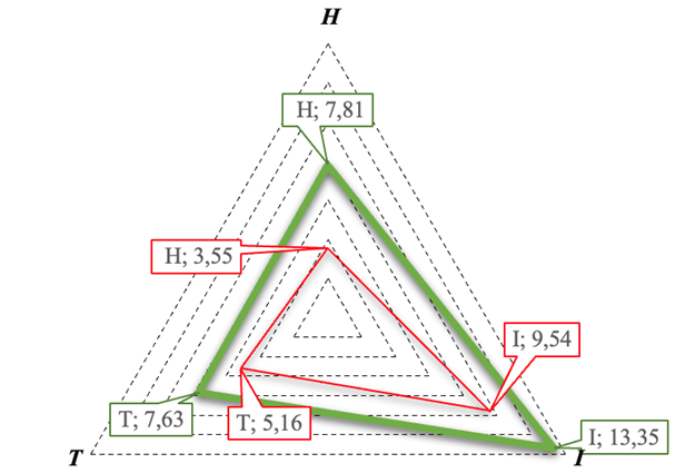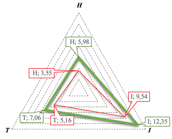 В качестве целевого (эталонного) значения индекса HIT принят уровень, равный 1,0. Данное значение соответствует полной реализации цифрового потенциала по всем ее компонентам: цифровой грамотности человеческого потенциала (H = 1), цифровых инструментов (I = 1) и развитости цифровой инфраструктуры (T = 1).