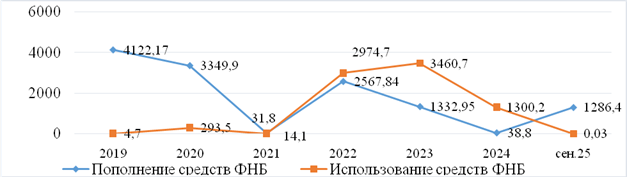 Рис. 1. Динамика пополнения и использования средств Фонда национального благосостояния за 2019-2024 гг., январь-сентябрь 2025 г. (фактические значения),