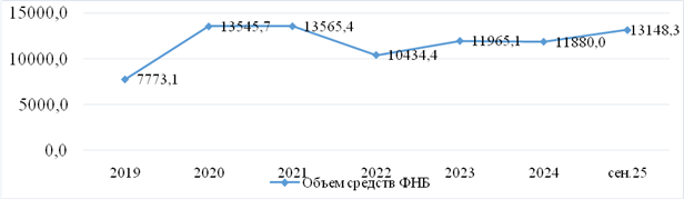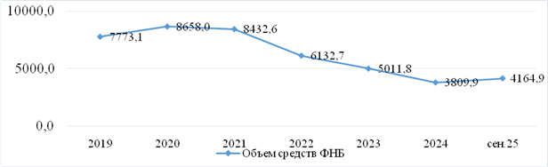 Рис. 4. Динамика общего объема средств ФНБ на конец года за 2019-2024 гг. и январь-сентябрь 2025 г. (фактические значения), млрд рублей