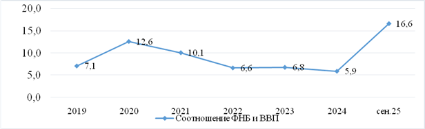 Рис. 6. Соотношение средств ФНБ и ВВП за 2019-2024 гг. и январь-сентябрь 2025 г. (фактические значения), %