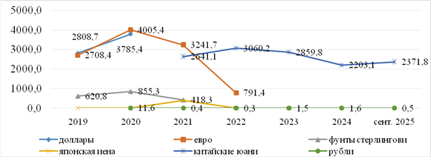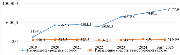 При этом в 2022 году произошел резкий скачок данного вида средств в рублях с последующим ежегодным существенным ростом этого показателя вплоть до сентября 2025 года. В основном это было связано с решениями о том, что в этот период времени в соответствии с заявленными целями и задачами прорывного развития нашей страны на перспективу, все больше средств ФНБ стало использоваться на финансирование инфраструктурных проектов, поддержку строительства крупномасштабных и других объектов в различных сферах деятельности нашего государства. Снижение объемов размещения средств ФНБ в иностранной валюте начиная с 2022 года также является объяснимым и связано с изменением геополитической ситуации, вынужденным разрывом многих международных связей России с зарубежными финансовыми партнерами, а также заморозкой активов Фонда, находящихся в иностранных банках.