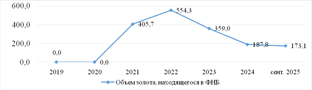 Рис. 10. Динамика объема золота, находящегося в ФНБ, за 2019-2024 гг., январь-сентябрь 2025 гг.(фактические значения), тонн