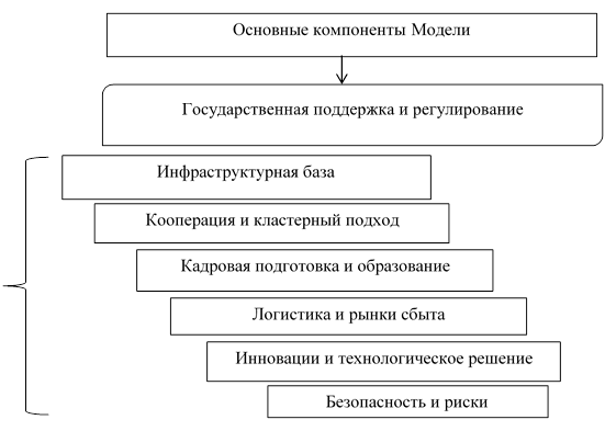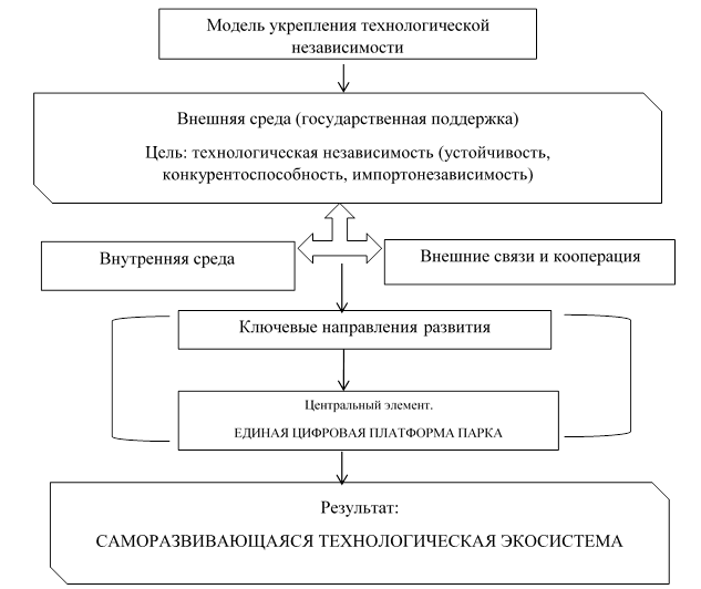 Технологический суверенитет предполагает замкнутую экономику и технологическое лидерство, означает выход и занятие первых позиций на рынках других стран, поэтому важен переход к новой экономической модели. В исследовании авторами разработана модель укрепления технологической независимости промышленных парков (рис. 3).