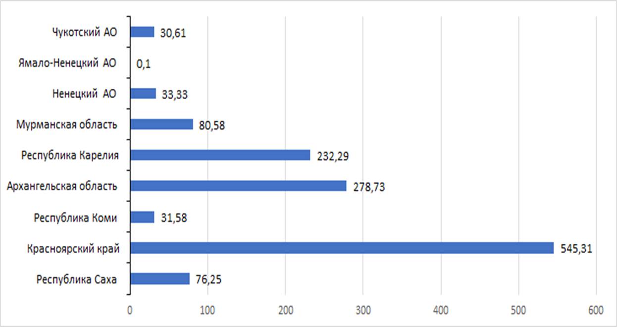 Анализируя объемы финансового обеспечения на реализацию региональных проектов «Туризм и индустрия гостеприимства» в рамках НП (рис 1), можно отметить определенные различия. Наибольший объем финансирования предусмотрен на реализацию мероприятий в туриндустрии Красноярского края, там осуществляется туристический проект «Хатанга», который станет «окном» на Северный полюс с организацией туристических высокоширотных экспедиций на регулярной основе. Также в Хатанге реконструирована гостиница «Заполярье» и планируется создание культурно-этнографического центра и туристического кластера. Кроме того, был модернизирован горнолыжный курорт «Лапарк» в Мончегорске, и планируется реализация крупного инвестиционного проекта «Затундра» с туристической деревней и сетью кемпингов. В Чукотском АО финансовые ассигнования были направлены на обустройство кемпинговых зон, в Мурманской области идёт развитие круизного туризма с посещением историко-этнографических комплексов, создание новых мест размещения (база отдыха «45 причал», туристический комплекс «Лапландская деревня», Глэмпинг «Aurоra Village», Купольный отель «Северное Сияние» и другие). В Республике Карелия в рамках проекта построен Эко-отель «Удивительное рядом». В Республике Коми в рамках проекта были построены глэмпинги и объекты кемпинг-размещения [1,3].