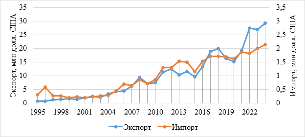 Следует особо отметить, что на рисунке 1 используются две равнозначные, но самостоятельные оси – для объемов российского экспорта и импорта в отдельности. Это обусловлено более чем десятикратным превышением российского экспорта из арабского региона над импортом: по данным на 2024 год, Россия экспортировала товары на сумму 29,2 млн долл. США, а импортировала из арабских стран всего на 2,1 млн долл. США [20]. В данном контексте введение в график вспомогательной масштабированной оси позволяет сравнить направления трендов и подтвердить их синхронность и устойчивость.