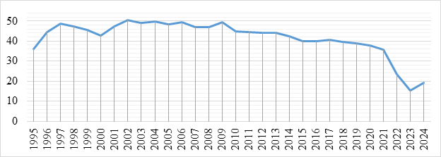 Сложившаяся исторически модель импорта России характеризуется существенным превалированием европейских товаров: в период с 2002 по 2009 год на ЕС приходилось около половины импорта России из-за рубежа. Впоследствии его доля постепенно снижается, а с 2022 года наблюдается падение до 15,2% в 2023 году и 19,2% в 2024 году соответственно (рис.2).