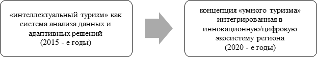 Рассмотренный в рамках таблицы материал позволяет говорить о том, что многие авторы рассматривают концепцию «умного туризма» как компонент экосистемы, который направлен на объединение технологических, институциональных и социальных элементов, и генерацию инноваций для туристской сферы, что в конечном счете позволяет создавать новый туристический опыт и повышать устойчивость отрасли. Также, анализ данных таблицы позволяет выделить два основных этапа в подходах к пониманию концепции «умного туризма» (рис. 1).