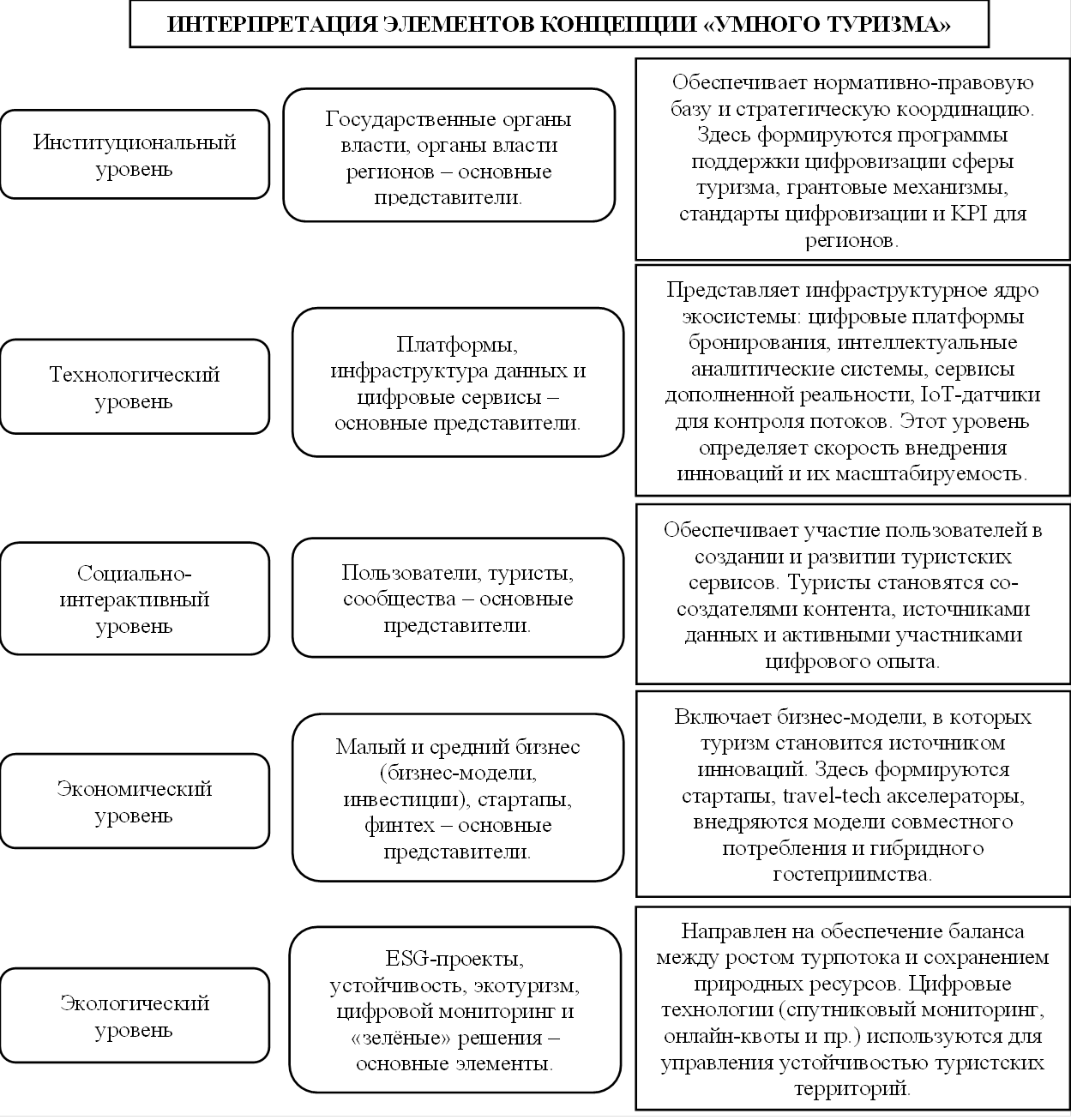 Введение. Стремительный рост темпов цифровизации и изменения предпочтений потребителей приводит к тому, что современный туристский рынок проходит этап глубокой трансформации. Потребитель теперь требует не просто отдых, а «умный» опыт – персонализированный и высокотехнологичный. Ситуация складывается таким образом, что во многом успех современных туристских предприятий и территорий определяется не тем насколько качественно они оказывают услуги, а тем насколько гибко и быстро они реагируют на изменения во внешней среде за счет внедрения инноваций. При этом, практика показывает, что даже при достаточном количестве внедренных технологий в регионах, большинство туристских территорий страны продолжают испытывать сложности коммуникации между основными акторами рынка, что еще сопровождается дублированием сервисов и зачастую полным отсутствием единой цифровой стратегии. На наш взгляд, это является подтверждением того, что внедрение технологий без экосистемного подхода и разработки стратегии не обеспечивает устойчивого эффекта.