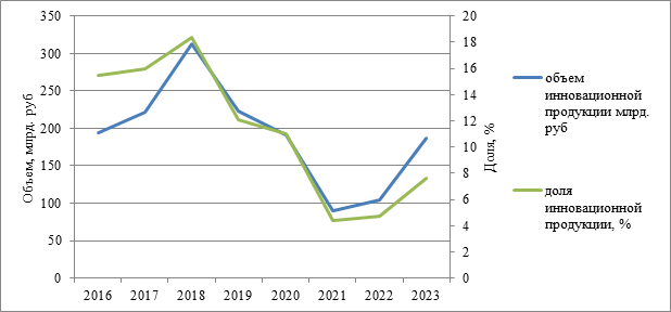 На рисунке 2 по левой вертикальной оси отображены данные объема инновационной продукции, а по правой – доли инновационной продукции в общем объеме производства. Как мы видим, динамика данных показателей практически тождественна.