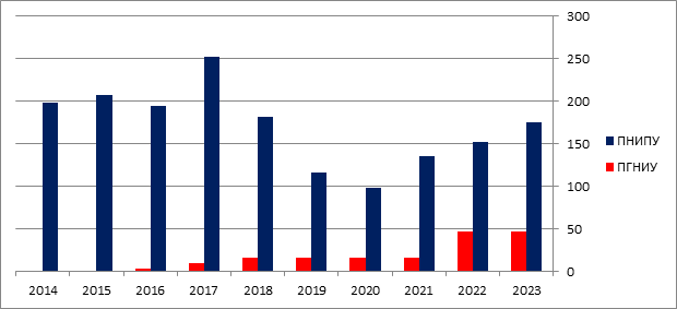 Рисунок 4 – Динамика числа обучающихся по целевым программам в национальных исследовательских университетах, локализированных в Пермском крае за 2014-2023 гг., ед.