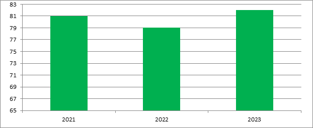 Из рисунка 5 видно, что уровень удовлетворенности работодателей качеством подготовки выпускников ПНИПУ за 2023 год достиг 82 %. В ПГНИУ по данным самообследования за 2022 год (за 2023 год информации нет) данный показатель составил 73%, а уровень удовлетворенности выпускников полученным компетенциями только 71 %.