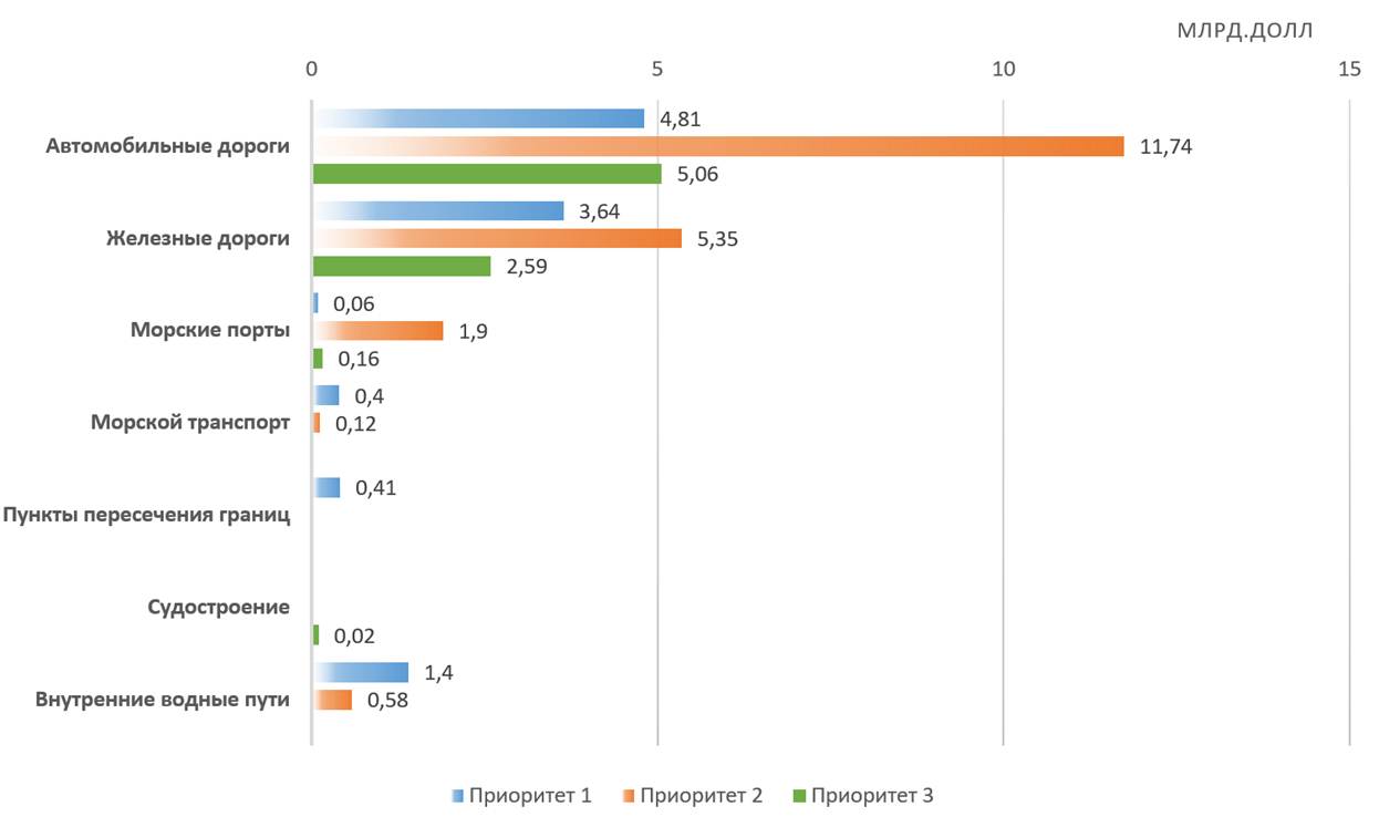 Согласно отчету ЕАБР, развитие наземной инфраструктуры коридора «Север – Юг» требует значительных капитальных вложений, особенно в автомобильные и железнодорожные сети (рис. 1). В данное направление направлено 59 проектов по автомобильным дорогам и 20 по железнодорожным, с общим бюджетом около 21,6 млрд и 11,6 млрд долларов соответственно [9].