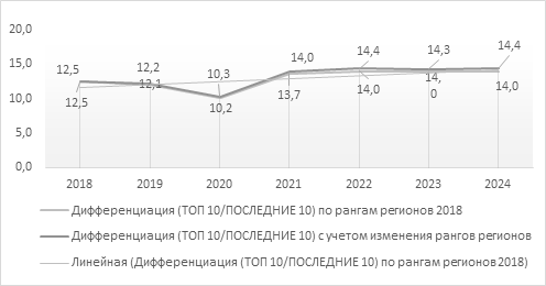 Как мы видим из Рисунка 1.1, уровень дифференциации существенно возрастает с 12,5 в 2018 г. до 14,0 в 2024 г., что говорит о текущей тенденции роста неравенства между уровнем жизни в различных регионах и территориальных единицах страны. Такой уровень разрыва в разы превышает параметры развитых стран.