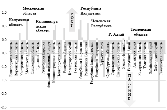 Как показал проведенный анализ, только 15% регионов с ростом сельского населения. На Рисунке 2 мы видим рост населения в очень незначительном количестве регионов: Калужская область, Московская область, Калининградская область, Республика Ингушетия, Чеченская Республика, Республика Алтай и Тюменская область. При этом в подавляющем большинстве регионов снижение сельского населения. Среди обуславливающих проблем оттока сельского населения приоритетными являются отсутствие рабочих мест и возможности самореализации, низкий уровень жизни населения в части предоставления услуг и др. [11; 23].