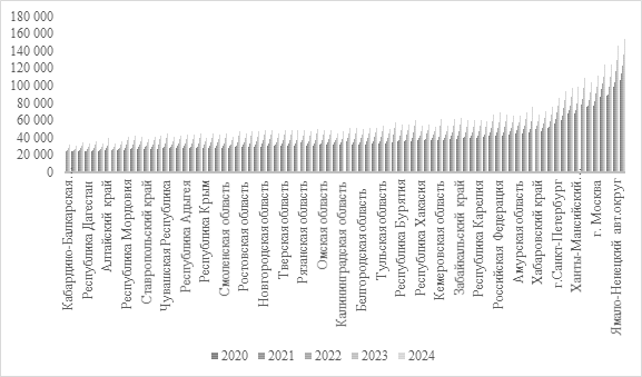 Как видно из Рисунка 1.3, рейтинговые позиции у регионов относительно постоянны. К регионам с низкой заработной платой относятся: Кабардино-Балкарская Республика, Республика Дагестан, Алтайский край, Республика Мордовия и др. Лидерами среди регионов по уровню заработной платы выступают Ямало-Ненецкий АО, г. Москва, г. Санкт-Петербург и др. Очевидно, что тенденция достаточно устойчива, т.к. за период 2020-2024 гг. рэнкинговые позиции регионов сохранялись.