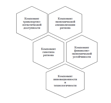Нами предлагается интегральная оценка уровня использования регионом своего комплексного потенциала (комплекс природно-климатических, минерально-сырьевых и социальных характеристик; финансовая устойчивость; освоение экономической специализации; транспортная связанность и др.). Это позволяет выявить резерв недоиспользования и направления совершенствования исходя из специфики его развития. Для этого мы сформировали региональную матрицу, исходя из классификационных признаков. Предлагается определять потенциал региона как совокупность компонент, представленных на Рисунке 1.4. [12; 14-18; 22].