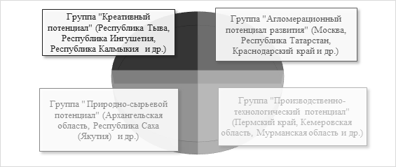 Группа «Креативный потенциал» регионов требует точечного рассмотрения и настройки, т.к. в этой группе присутствуют регионы с титульным этносом традиционного уклада, что необходимо учитывать при формировании направлений развития [8].