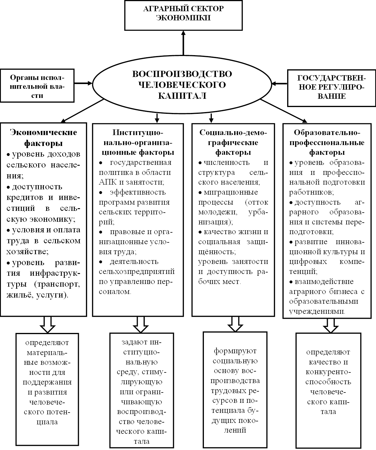 На рисунке 1 представлена структура факторов, влияющих на воспроизводство человеческого капитала в сельском хозяйстве. Воспроизводство человеческого капитала определяется совокупностью условий экономического, социального, образовательного и институционального характера. Все эти факторы задают институциональную среду и качество трудового потенциала, формируют материальную и социальную основу развития человеческого капитала.