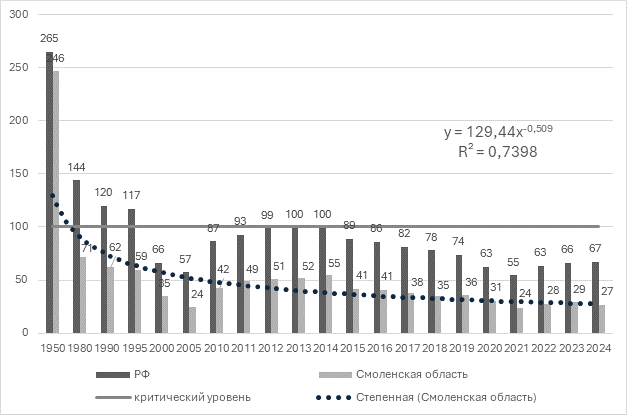 После экономического кризиса 2014 года негативные тенденции в динамике индекса жизненности сельских территорий были присуще как России в целом, так и большинству регионов. Начиная с 2015 года в целом по России данный коэффициент становится ниже критического значения (100 %). Для сельского населения Смоленской области этот критерий последние 10 лет не превышает 41%, соответственно население региона за счет естественного движения сокращалось резкими темпами, что свидетельствует об отрицательных трендах демографических процессов в области.