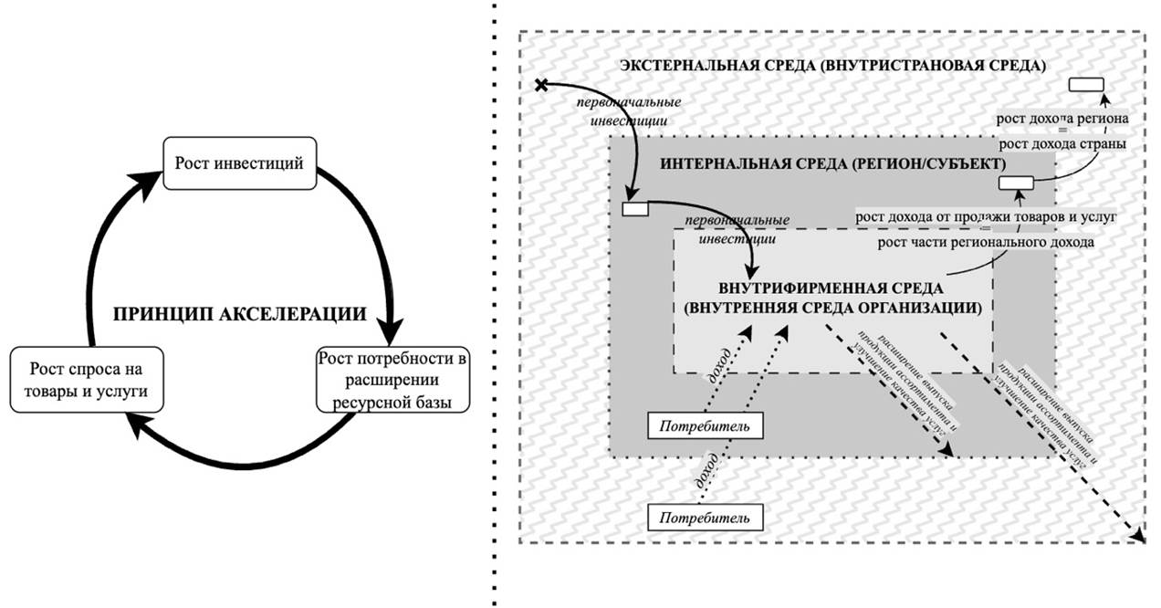 Принцип акселерации и мультипликативный эффект являются взаимосвязанными понятиями в условиях изучения проблем роста региональной экономики. Данные концепции пересекаются в вопросе аргументирования взаимозависимости таких понятий, как инвестиции, доход, производство и потребление с течением времени. Теория мультипликатора объясняет, что инвестиции в отрасль приводят к росту доходной части и потребления, что ведет к необходимости интенсифицировать производство, тогда как принцип акселератора предполагает, что рост дохода может привести к увеличению объема инвестиций из-за повышения спроса на товар или услугу [20].