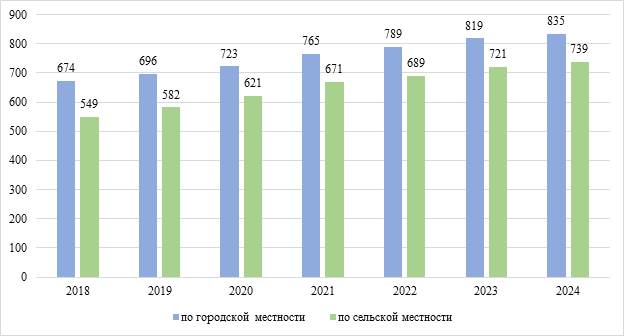 Согласно данным Росстата, обеспеченность детей дошкольного возраста местами в организациях за последние годы растет, как в городской, так и в сельской местности (Рис.1). По данным на 2024 год, в России на 1000 детей дошкольного возраста приходится 835 мест в городах, 739 мест – в сельской местности.