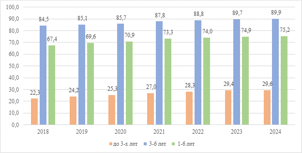 Рисунок 2. Охват детей различных возрастных групп дошкольным образованием, 2018 – 2024. Составлено авторами по данным Росстата [8].