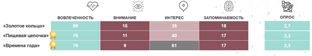 Первичный анализ таких метрик как вовлеченность, внимание, интерес и запоминаемость, представленных на рисунке 2, демонстрирует, что уровень вовлеченности младших школьников в просмотр образовательного контента по всем трем роликам достаточно высокий (зеленая зона), это говорит о том, что дети испытывают достаточно яркие эмоции различного спектра действия. Уровень интереса представлен средними значениями (розовая и серая зона), это свидетельствует о том, что демонстрируемая им информация заставляет их задуматься, но без глубоко погружения. При этом, уровень внимания и запоминаемости максимально низкие (красная зона), что для образовательного контента является крайне негативным моментом.