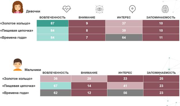 Следовательно, работа над показателем «внимание» позволит привести к более высокому уровню запоминаемости школьниками, что является основной целью создания любого образовательного контента.