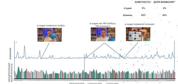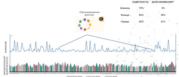 Рис. 4. Анализ динамики показателей «эмоциональная вовлеченность», «внимание» и «заметность зон интереса» ролика «Золотое кольцо»