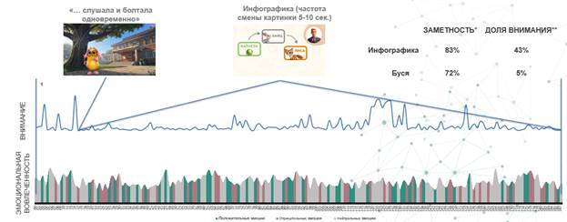 Оценка заметности зон интереса показала, что персонаж Буся не отвлекает внимание зрителей от демонстрируемого образовательного контента. Так, при достаточно высоком уровне заметности (72%) Буся привлекает к себе лишь 5% внимания ребенка, а 43% внимания концентрируется на основном контенте, демонстрируемом в виде инфографики. Можно сделать вывод, что персонаж подобран правильно.
