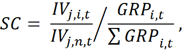 где, SC – значение коэффициента специализации, пороговым значением которого, указывающим на наличие у региона специализации по ВЭД, является единица; IVj,i,t – объем производства отрасли j региона i за период t в денежном выражении; IVj,n,t – объем производства отрасли j страны n за период t в денежном выражении; GRPi,t – объём произведённого валового продукта регионом i за период t.