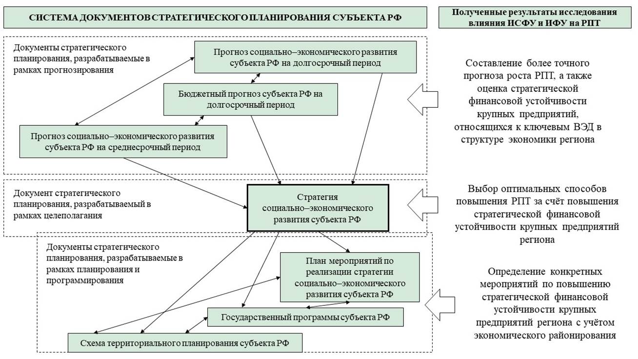 Результаты проведённого исследования могут быть применены при разработке или актуализации всех указанных документов, поскольку они взаимосвязаны. Основной документ стратегического планирования региона – стратегия социально–экономического развития, которая разрабатывается на основе бюджетных и социально–экономических прогнозов. Схема территориального планирования, план мероприятий по реализации стратегии социально–экономического развития и государственные программы субъекта являются механизмами реализации региональной стратегии, поэтому включение полученных результатов в один из документов стратегического планирования региона должно повлиять и на другие зависимые от него документы. При этом целесообразно учитывать взаимосвязь стратегической финансовой устойчивости крупных предприятий и РПТ уже при разработке прогноза социально–экономического развития субъекта РФ, как отправной точки по разработке остальных документов стратегического планирования региона (рис. 1).