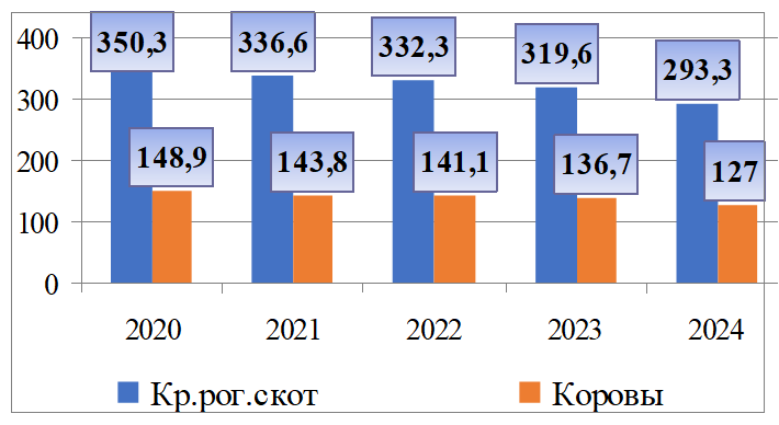 В период с 2020 по 2024 год зафиксировано снижение численности скота во всех категориях хозяйств: крупный рогатый скот сократился на 8,4 п.п., коровы на 8,5 п.п. (рис. 1). Наблюдается устойчивая тенденция к уменьшению поголовья, обусловленная главным образом укрупнением ферм и внедрением передовых технологий производства.