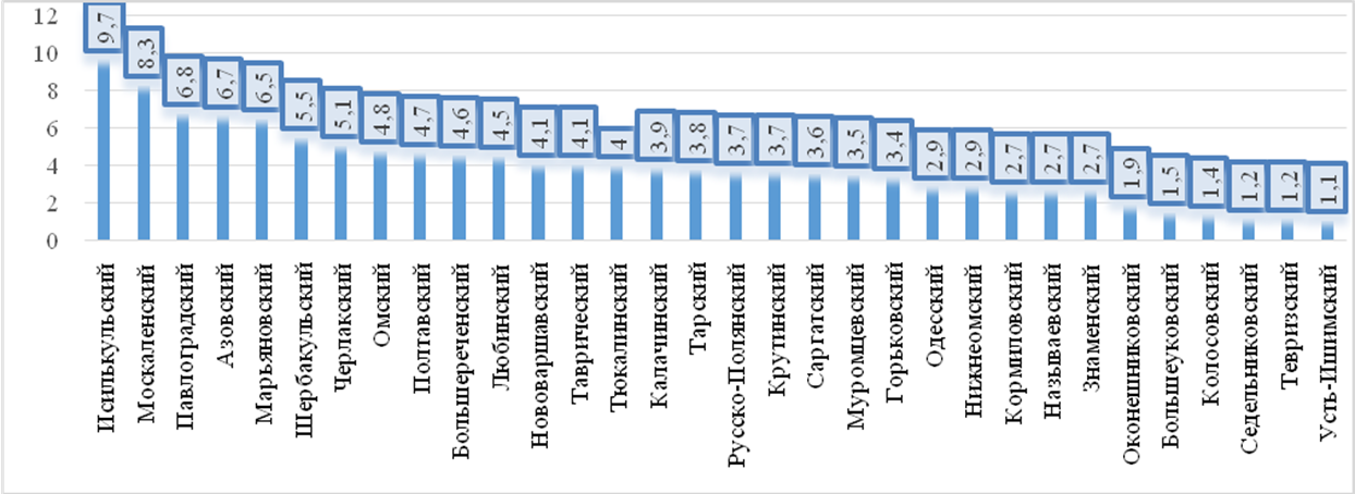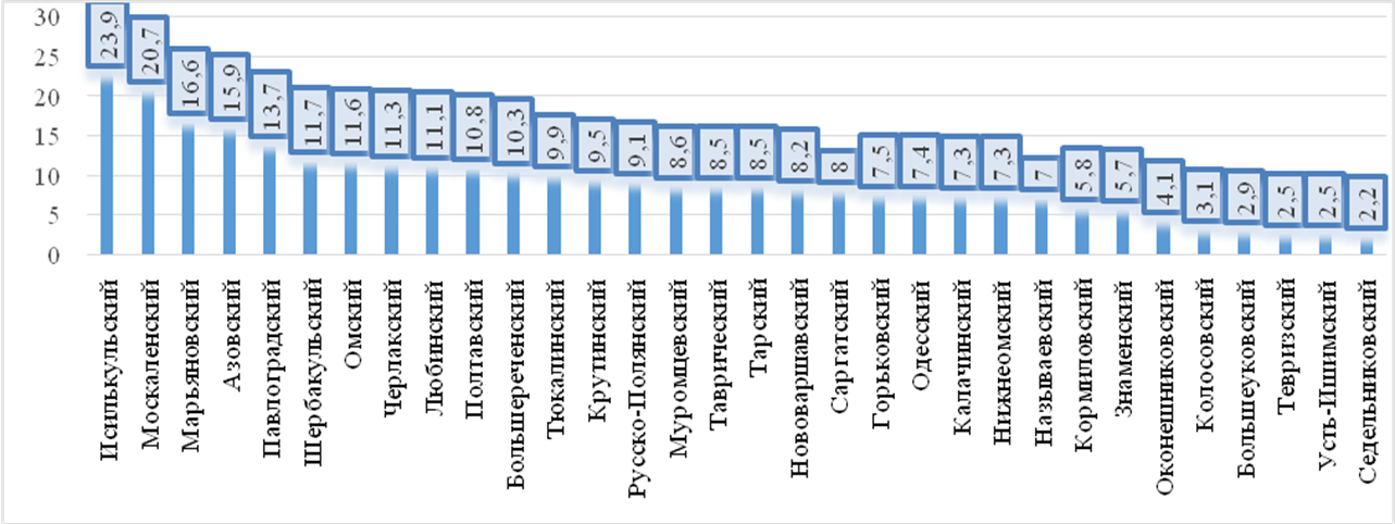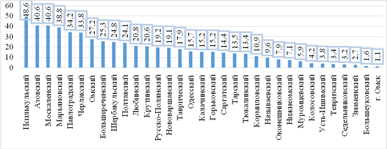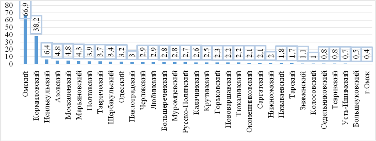 Это распределение отражает различия в кормовой базе, климатических условиях и традициях ведения сельского хозяйства в разных зонах Омской области (рис. 6).