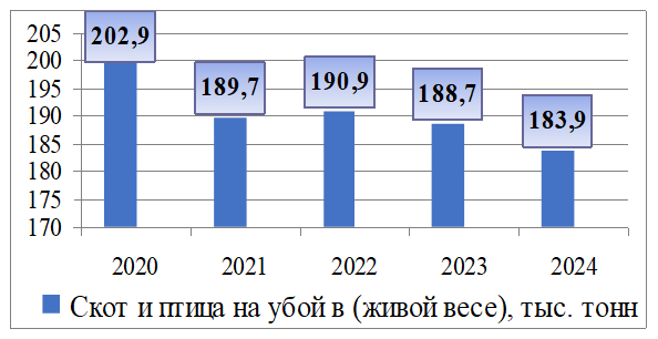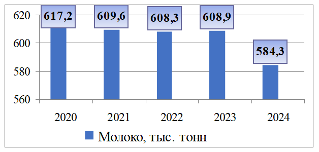 Омская область уверенно держит позиции одного из ключевых аграрных регионов России, и животноводство здесь играет первостепенную роль. Эта отрасль является приоритетной, генерируя более 45% валовой продукции, концентрируя 75% основных производственных фондов и обеспечивая занятость 60% трудовых ресурсов в сельском хозяйстве [22]. В 2024 году омские животноводы показали следующие результаты: производство молока составило 608,9 тыс. тонн (96,0% к уровню 2023 года), мяса – 179,4 тыс. тонн (97,8%) [22].