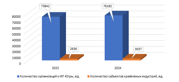 Рисунок 1 – Динамика количества организаций и индивидуальных предпринимателей Югры, включая субъектов креативных индустрий, за 2023-2024 гг.