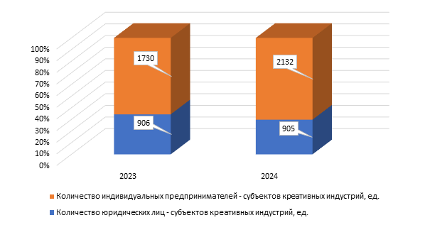 - количество субъектов креативных индустрий (организаций и индивидуальных предпринимателей) составило 3037 ед., что на 15% больше аналогичного показателя за 2023 год, при этом их доля в общей численности организаций и индивидуальных предпринимателей занимает всего около 4% (рис. 1);