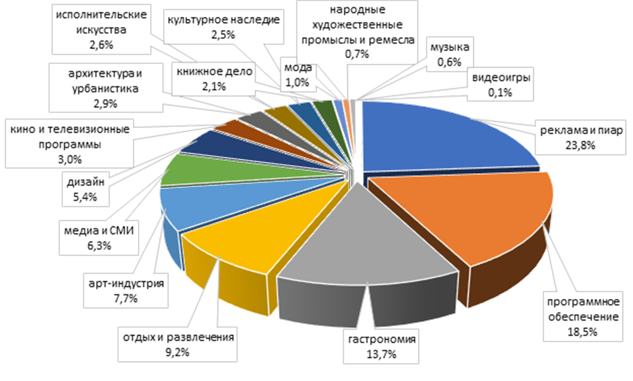 - по направлениям деятельности в пятерку лидеров в 2024 году (рис. 4) вошли: «реклама и пиар» - 23,8%, «программное обеспечение» - 18,5%, «гастрономия» - 13,7%, «отдых и развлечение» - 9,3%, «арт-индустрия» - 7,7%; аналогичная структура наблюдалась и в 2023 году (рис. 3); наибольший относительный прирост количества субъектов креативных индустрий в 2024 году по сравнению с 2023 годом был выявлен по направлениям «музыка» - 58%, «видеоигры» - 50%, «реклама и пиар» - 31% и «дизайн» - 28%; следует отметить и наименее популярные направления: «исполнительские искусства», «книжное дело», «культурное наследие» и «народные художественные промыслы и ремесла», по которым количество субъектов в 2024 году хоть и не значительно, но снизилось по сравнению с 2023 годом;