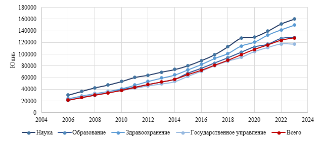 Для проведения оценки дифференциации заработной платы бюджетных работников Китая применен комплекс методов, основанный на принципах системного и сравнительного анализа. Основой стал анализ официальных статистических данных, публикуемые Государственным статистическим управлением Китайской Народной Республики (далее – КНР) – Статистический Ежегодник за период 2005-2024 гг. [28] В рамках этого направления изучены агрегированные показатели по среднемесячным трудовым доходам работников по отраслям бюджетной сферы: образование, здравоохранение и наука, в том числе по территориальным единицам Китая.