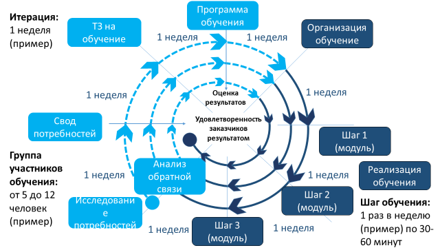 Особенность применительно к обучению – как можно быстрее предоставить заказчикам продукт (знания и навыки, преобразованные в результат работы), переходить к следующей итерации, используя результаты предыдущей и уточненные требования. Каждый виток по сути является «раскрученной» последовательностью этапов, представленных выше. Количество витков, которые нужно пройти, зависит от сложности решаемых задач и других условий.