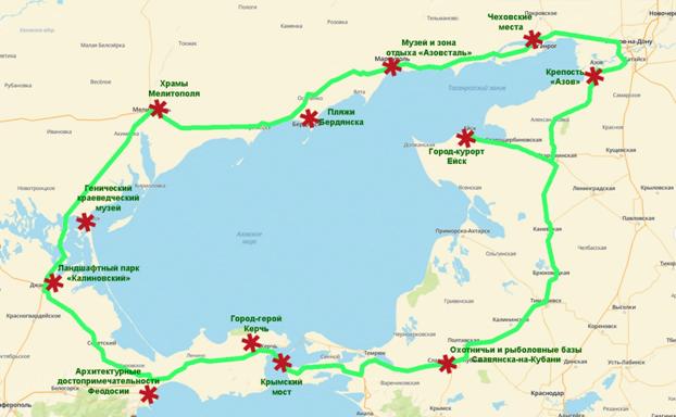 Первым направлением (1-2 год) должна являться «туристическая реанимация» регионов, которая может рассматриваться как инструмент оперативного создания доходных рабочих мест и первичного восстановления инфраструктуры [18]. Ядром стратегии должно являться включение проекта «Азовского кольца» (рис.3.), подразумевающего строительство транспортного кольца вокруг Азовского моря, протяженностью около 1400 километров и связывающего такие населенные пункты как Ростов-на-Дону, Таганрог, Мариуполь, Бердянск, Мелитополь, Геническ, Джанкой, Керчь, Темрюк, Ейск и Азов, в стратегию развития туризма в Российской Федерации на период до 2035 года [2].