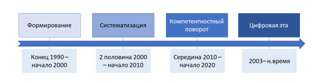 Становление системы профессионального развития государственных служащих в Российской Федерации детерминировано рамками трансформации политической системы, сменой парадигм управления и технологическими вызовами, отражая переход от постсоветской бюрократии к цифровой эпохе. Можно выделить несколько ключевых этапов этого процесса (Рисунок 1):