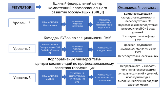 При формировании современного института профессионального развития государственных служащих требуется создать единый методологический и методический центр, обеспечивающий разработку и внедрение единого подхода на 3-х уровнях (стратегическом, тактическом и операционном), предоставляя возможность органам власти совместно с корпоративными университетами (3 уровень) финансировать, планировать и реализовывать адресные и актуальные для работодателя и работника программы в рамках концепции «быстрореагирующего обучения»/спирально-итерационных технологий, позволяющих укреплять конкурентоспособность работодателя и мотивацию служащего.