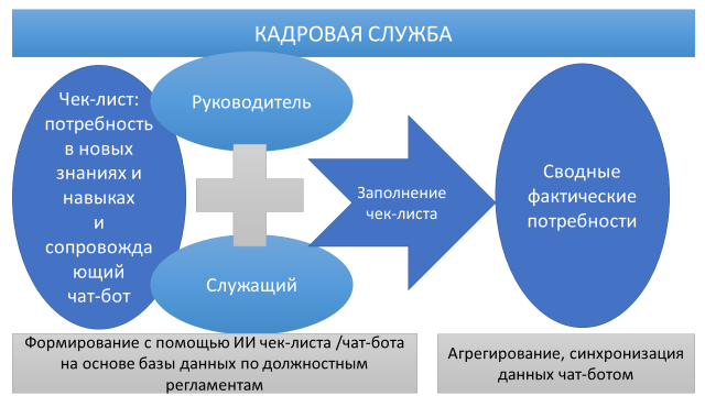 Определение потребности должно идти с двух сторон (от 2-х заказчиков: потенциального участника обучения и его руководителя): по одной форме чек-листа, который может формироваться на основе функционала должностного регламента и созданных ИИ перечней знаний и навыков, необходимых для выполнения конкретной функции (Рисунок 4).