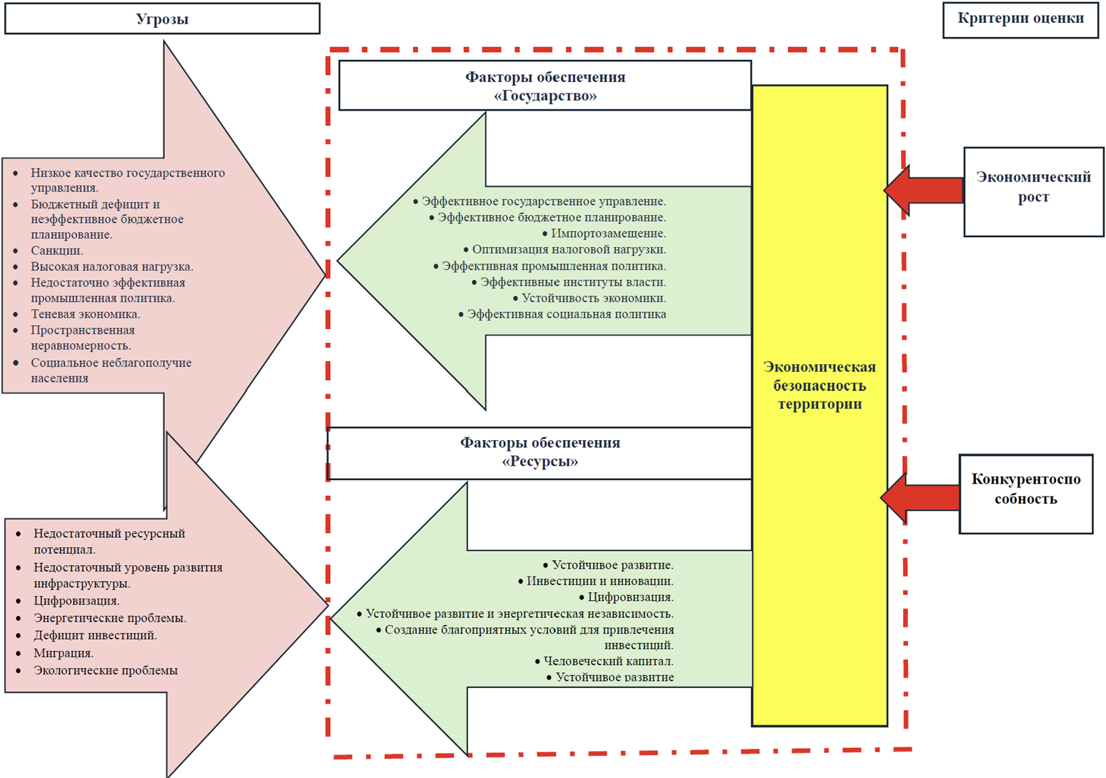 Обеспечение экономической безопасности территорий мы рассматриваем в контексте действия факторов, противодействующих угрозам экономической безопасности, которые мы предлагаем рассматривать с позиций двух критериев «государство» и «ресурсы». При этом состояние экономической безопасности территории мы предлагаем оценивать с позиций двух критериев: экономического роста и конкурентоспособности.