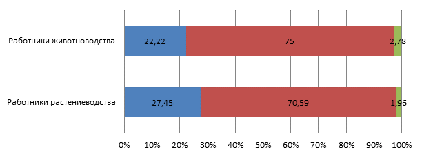 По данным проведенного конъюнктурного обследования качества кадрового обеспечения сельскохозяйственных предприятий Омской области в целом удовлетворены уровнем теоретической подготовки рабочих растениеводства и животноводства 27,45% и 22,22% руководителей опрошенных хозяйств, в среднем - 70,59% и 75%, не удовлетворены -1,96 и 2,78% соответственно (Рисунок 1).