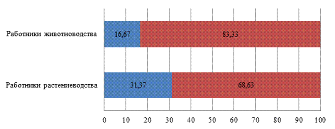 Полностью удовлетворены уровнем практической подготовки работников растениеводства 31,37% руководителей опрошенных хозяйств (Рисунок 2); в целом удовлетворены уровнем практической подготовки работников животноводства 16,67% (были приняты работники, как со средним профессиональным образованием, так и с начальным профессиональным образованием).