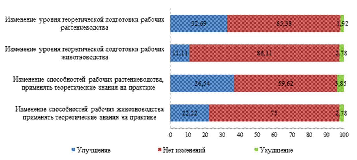Изменение уровня теоретической подготовки рабочих растениеводства и животноводства (знание новейших технологий, техники, оборудования и т.д.) и изменение способностей работников, применять теоретические знания на практике (по данным мониторинга), представлены на рисунке 3.