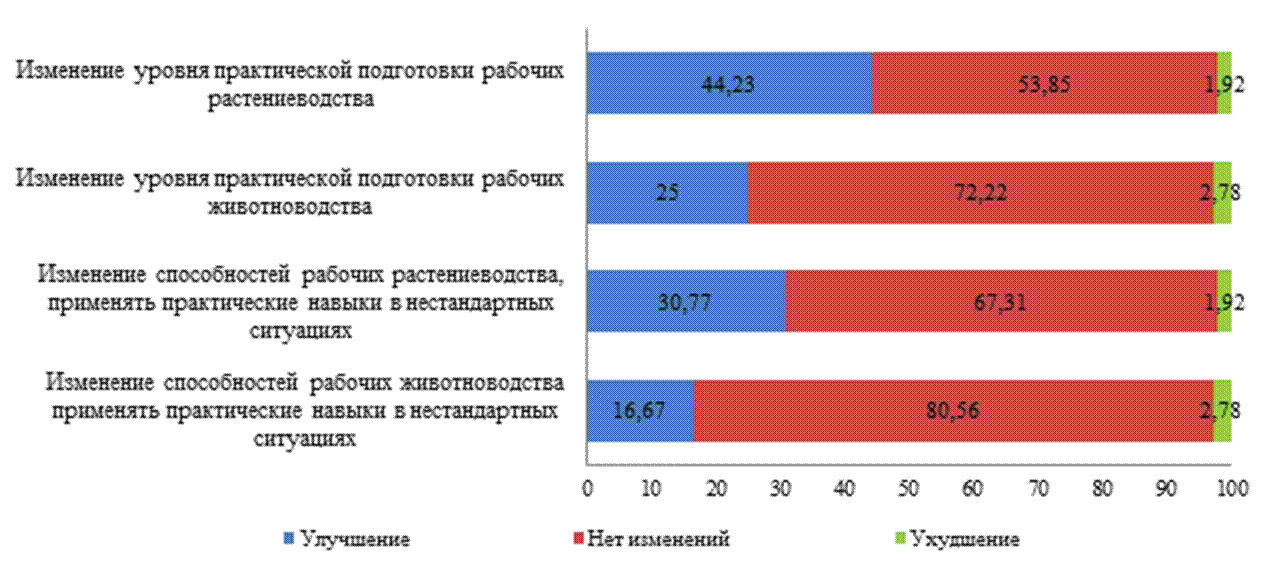 Изменение уровня практической подготовки работников растениеводства и животноводства (умение применять новейшие технологии, умение работать на новой технике и оборудовании и т.д.) и изменение способностей рабочих, применять практические навыки в нестандартных ситуациях (по данным мониторинга), представлены на рисунке 4.