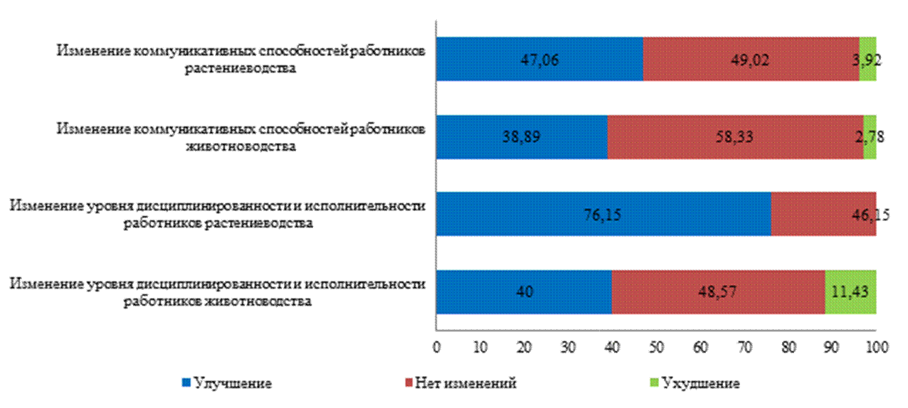 Изменение коммуникативных способностей (умение находить общий язык с другими работникам предприятия, эффективная совместная работа и т.д.), уровня дисциплинированности и исполнительности рабочих растениеводства и животноводства, представлено на рисунке 6.